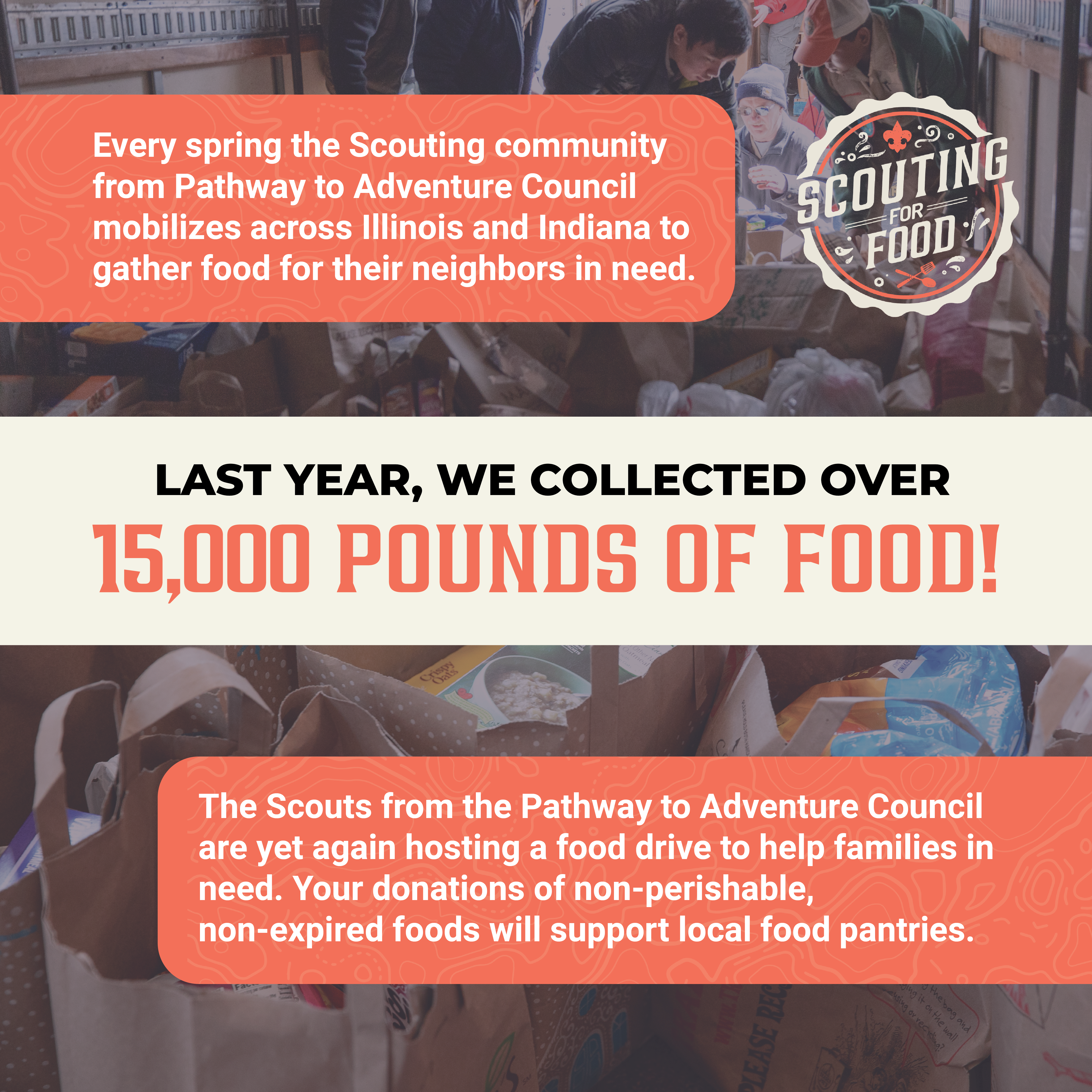 Every spring the Scouting community from Pathway to Adventure Council mobilizes across Illinois and Indiana to gather food for their neighbors in need. Last year, we collected over 15,000 pounds of food!